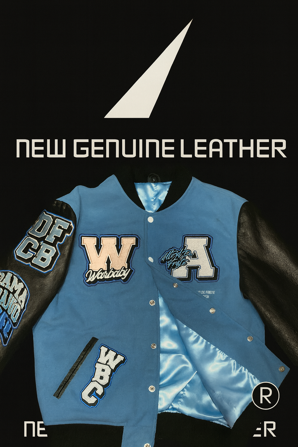 About the Design: This varsity jacket features iconic chenille letter patches including “W” and “A” on the chest, custom “DFGB” numbering on the left sleeve, and additional varsity graphics. The combination of sky blue wool and black leather creates a striking contrast that honors traditional letterman jacket heritage while making a contemporary fashion statement.